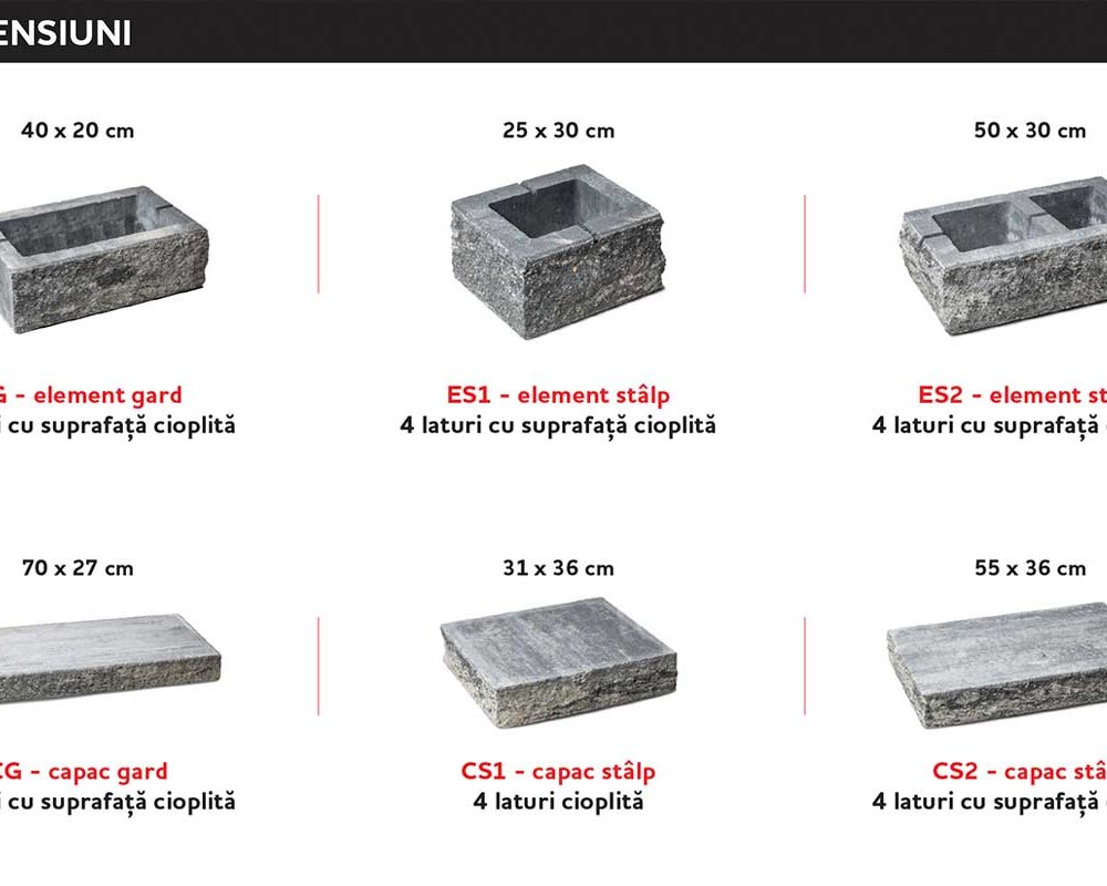 Fabricat prin tehnologia de vibropresare elementele de gard pot asigura prin versatilitate – poate fi folosit și pentru o delimitare tip perete cât și combinată cu lemn sau fier forjat, – vor conferi stil dar și soliditate imprejmuirii proprietății dumneavoastră.